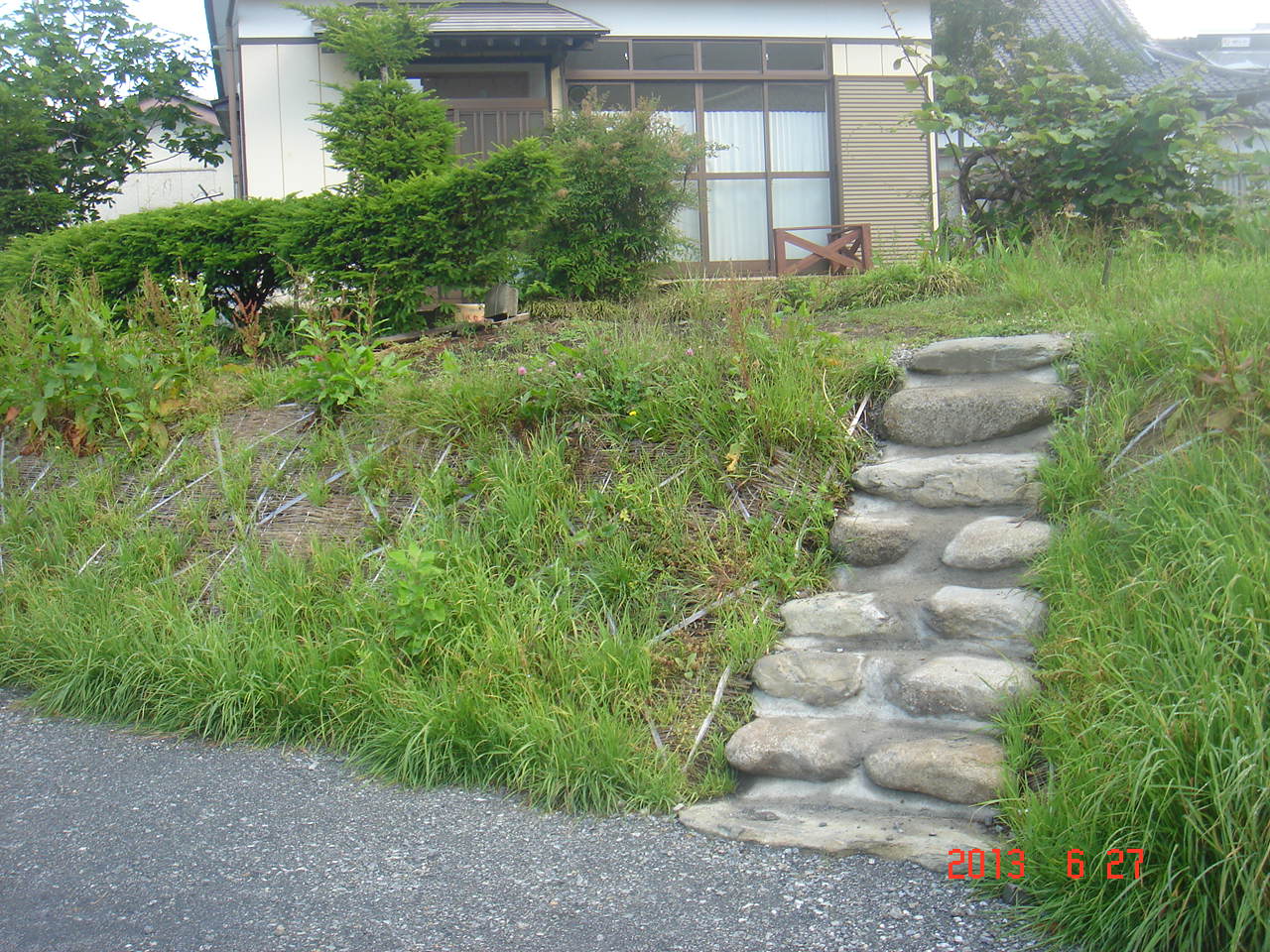 Bごみ置き場の棚と屋根 C洗濯機の設置場所の基礎と屋根 D畑への階段