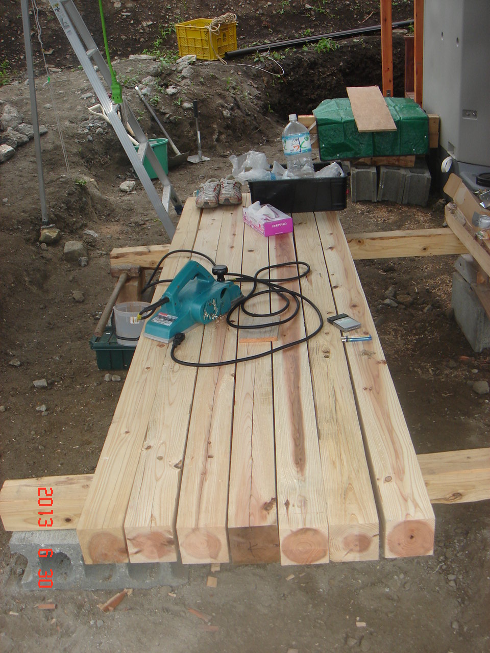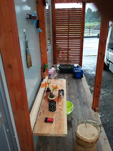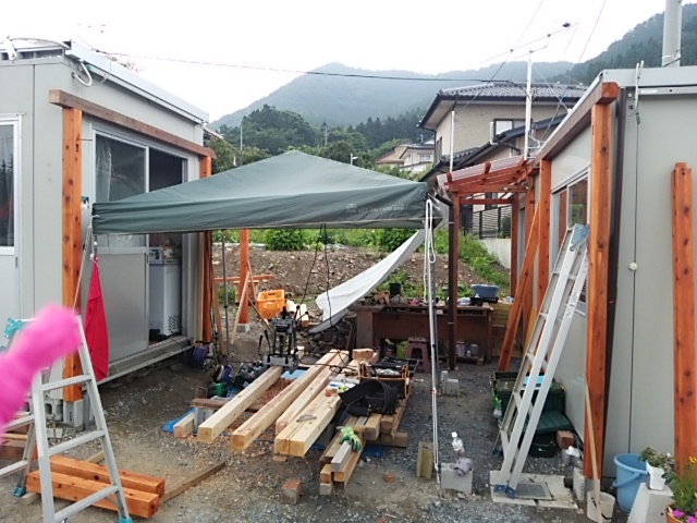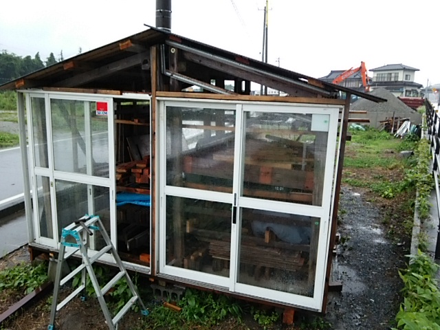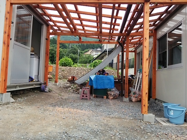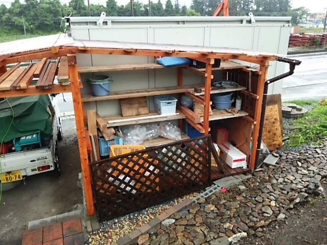 @作業室と物置間の屋根 A昨年盛岡から持ってきた木材の整理と収納小屋の設置