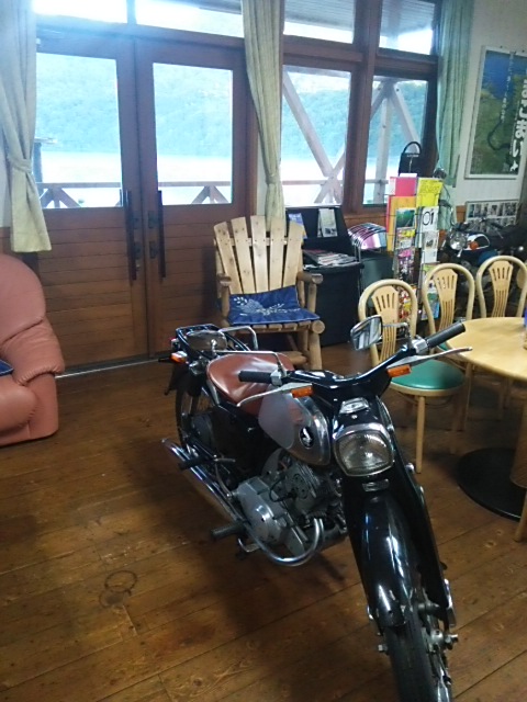 窓の外が支笏湖、山荘の中に何故かホンダベンリィが。